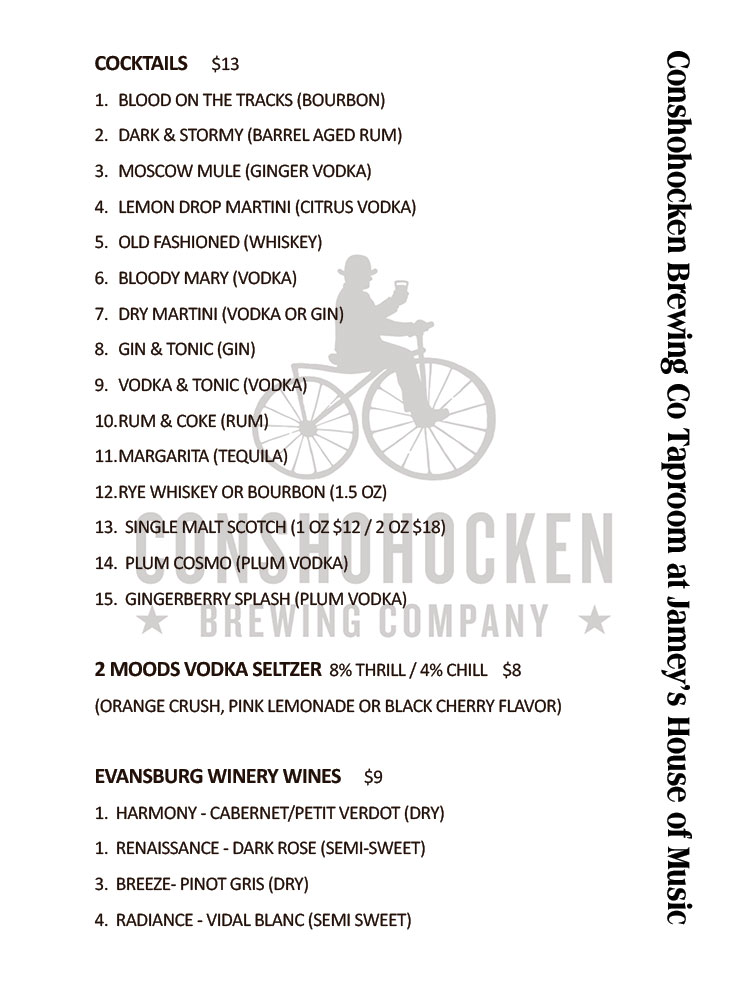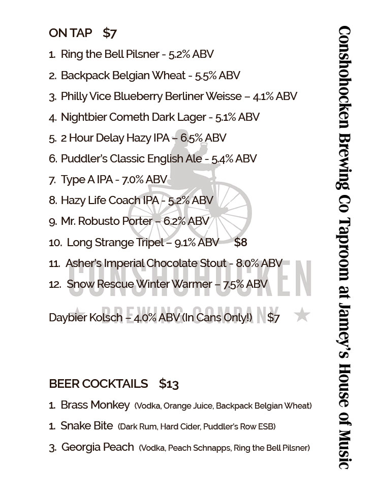 CONSHOHOCKEN BREWING COMPANY now has a location right inside Jamey's house of Music! An award winning PA based craft brewery, Conshy specializes in small batch brews of the highest quality featuring IPAs, imperials, ESBs, pilsners, whites, pales, stouts, porters, double IPAs, wheats, and various spiced ales. Wine drinkers will enjoy our house white and red by Chaddsford Winery, a delicious hard cider and PA distilled spirits for your favorite mixed drinks.